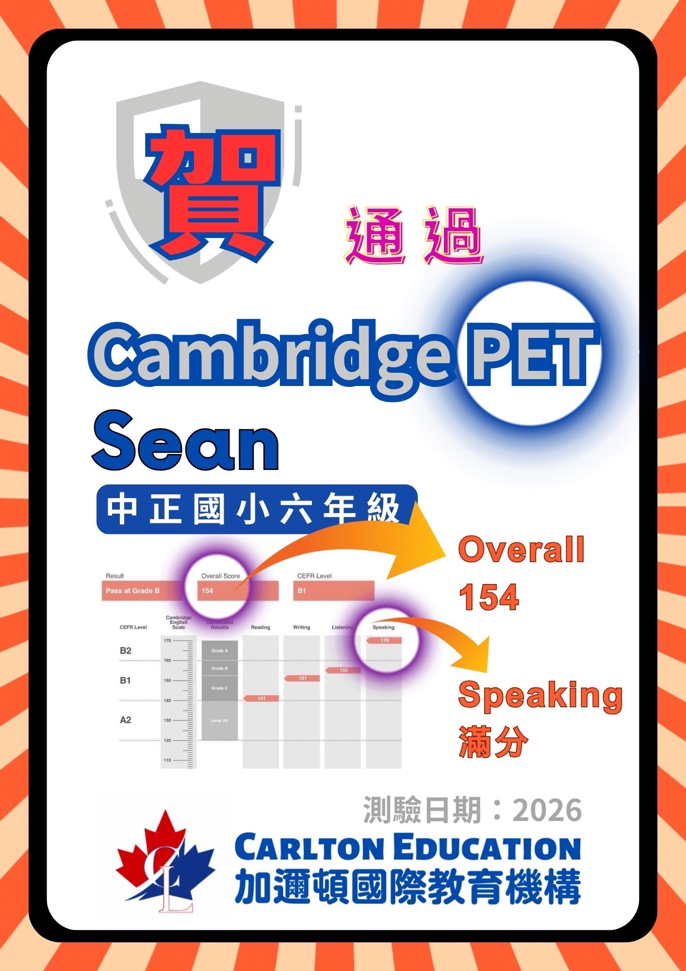 恭賀加邇頓 Sean 通過 Cambridge PET